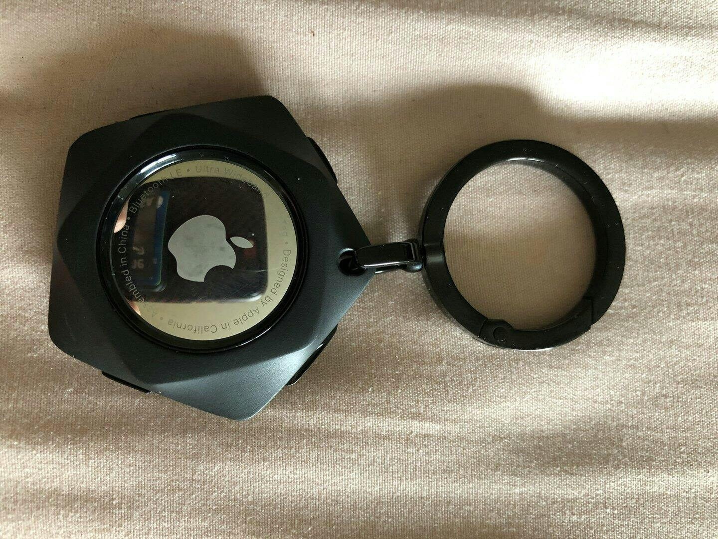 Hold the metal AirTag case, twist anticlockwise to open the cover; put your AirTag inside the case, then twist clockwise to lock it.