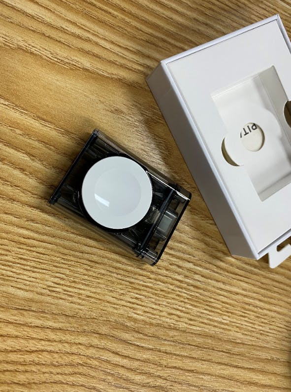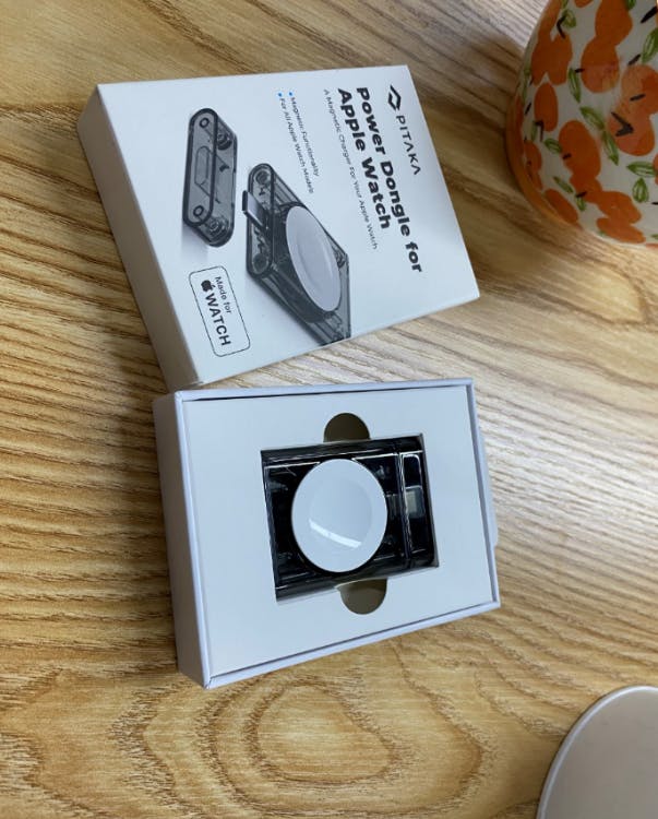 An MFi-certified wireless charging dongle for Apple Watch models.